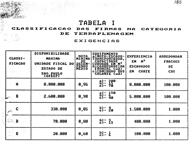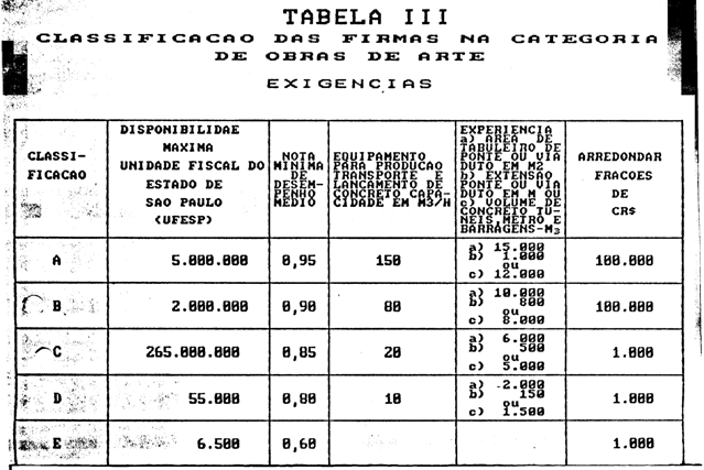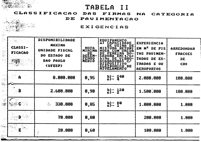 Artigo 2º - As tabelas com as exigências para classificação das empresas nas categorias de Terraplenagem, Pavimentação e Obras de Arte, constantes nas Condições Gerais Para Contratação e Licitação de Obras e Serviço 01/91, publicadas no Diário Oficial de 27/11/91, passam a ser as anexas à presente Portaria.