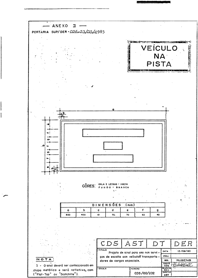 f) 2 placas metálicas refletivas, com os dizeres: “VEÍCULOS NA PISTA”, que deverão ser acopladas a cavaletes ou ao veículo de escolta, nas medidas de 0,80m (oitenta centímetros) por 0,40 m (quarenta centímetros), escritas com letras pretas, em fundo branco, de acordo com o respectivo modelo (anexo II);