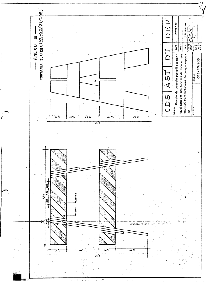 j) mínimo de 2 (dois) cavaletes portáteis, desmontáveis, com suporte para colocação dos dispositivos mencionados nos itens f e i deste artigo, consistindo em 2 (duas) tábuas horizontais de 0,20 m (vinte centímetros) de largura por 1,20m (um metro e vinte centímetros) de comprimento, espaçadas verticalmente de 0,60 m (sessenta centímetros) de centro a centro, com o bordo superior da tábua de cima a uma altura de 1,20 m (um metro e vinte centímetros) acima do nível da rodovia, pintadas com faixas, nas cores laranja e branca e com largura de 0,10m (dez centímetros) cada, formando um ângulo de 45° (quarenta e cinco graus) com a horizontal, de acordo com o respectivo modelo (anexo III).