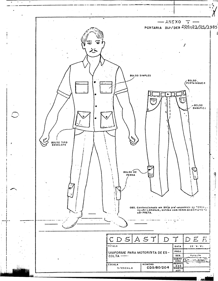 Artigo 13 - O motorista do veículo deverá usar uniforme tipo “safari” (jaqueta e calça), na cor laranja, dispondo de cinto e braçadeira de material refletivo, para uso à noite, em casos de emergência, de acordo com o respectivo modelo (anexo V).